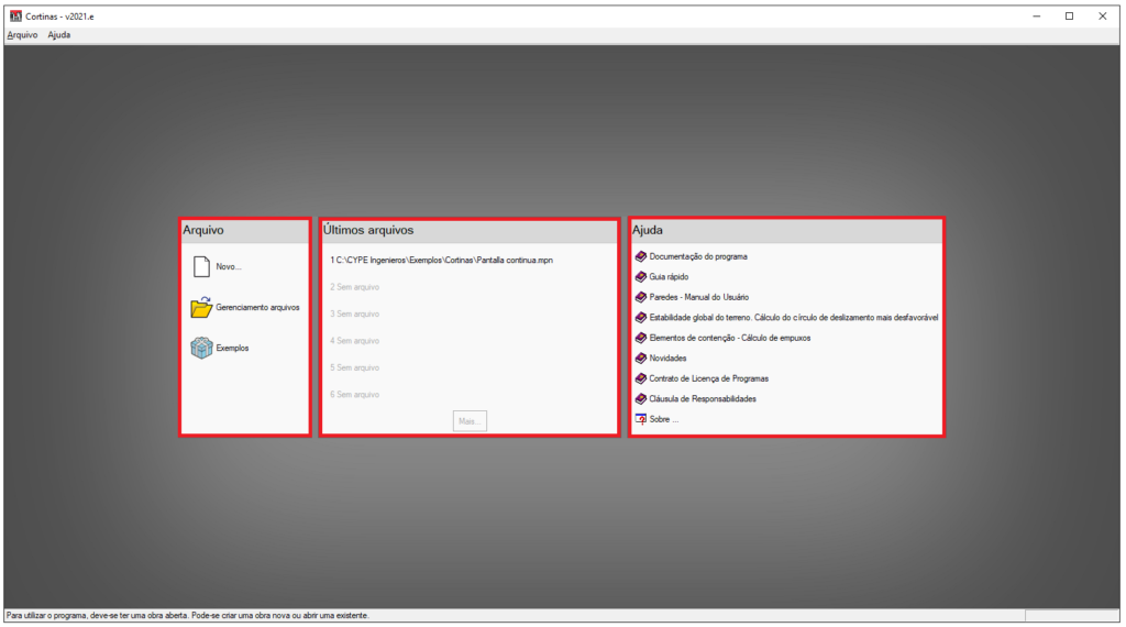 Se você tem a versão mais recente do software CORTINAS ATIRANTADAS, ao abrir o software vai perceber que existem três colunas no centro da tela, mesmo não tendo nenhum arquivo novo ou existente de uma obra aberta, essas três colunas serão apresentadas, são elas: A coluna ARQUIVO, ÚLTIMOS ARQUIVOS e AJUDA.