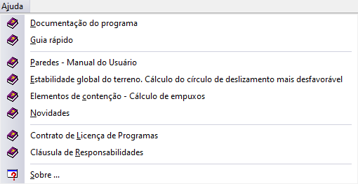 Na coluna AJUDA você vai encontrar oito documentos em PDF, incluindo o Paredes – Manual do Usuário que é o manual passo a passo para aprendizado do software MUROS DE ARRIMO.