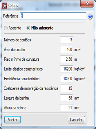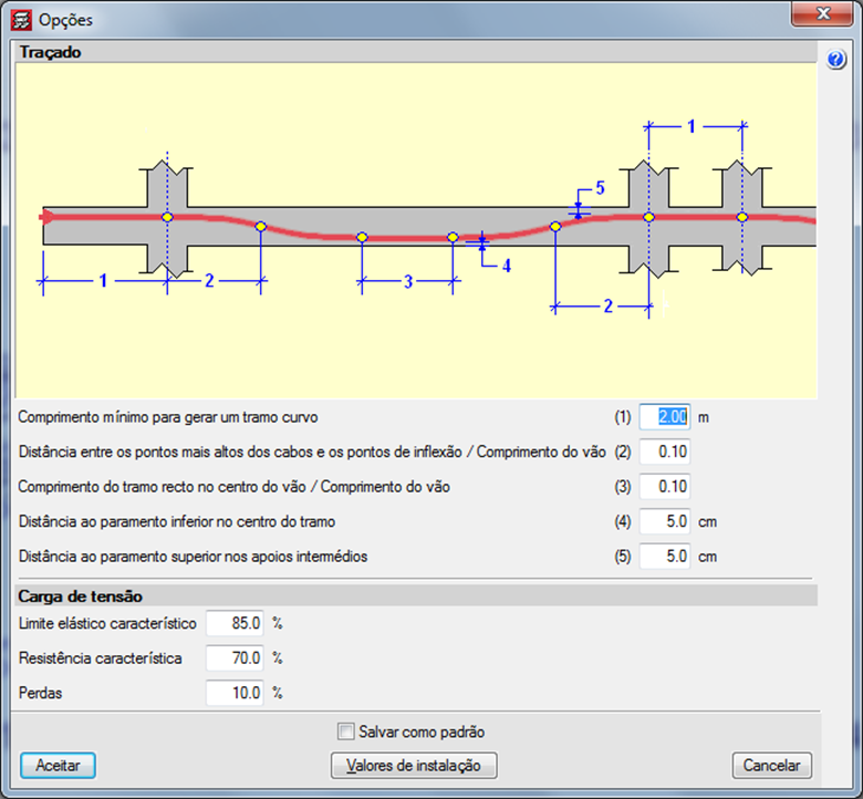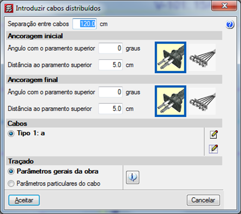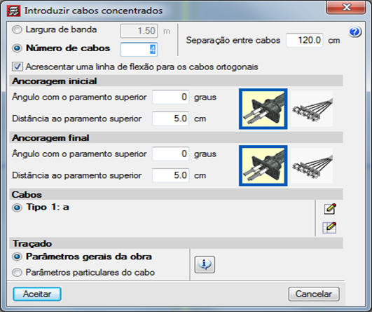 Atribua o número de cabos que deseja inserir, o espaçamento entre as cordoalhas, a angulação da ancoragem do tensionador inicial e final