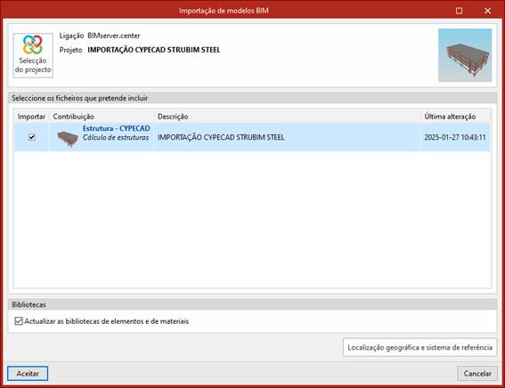 Uma fez feita a importação de um modelo BIM da estrutura, desenvolvido no CYPECAD, o StruBIM Steel importará os perfis e adicioná-los-á à biblioteca do projeto automaticamente caso eles sejam compatíveis com o programa.