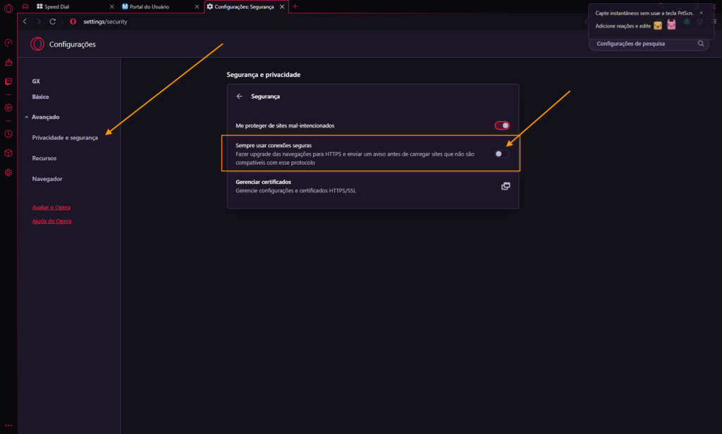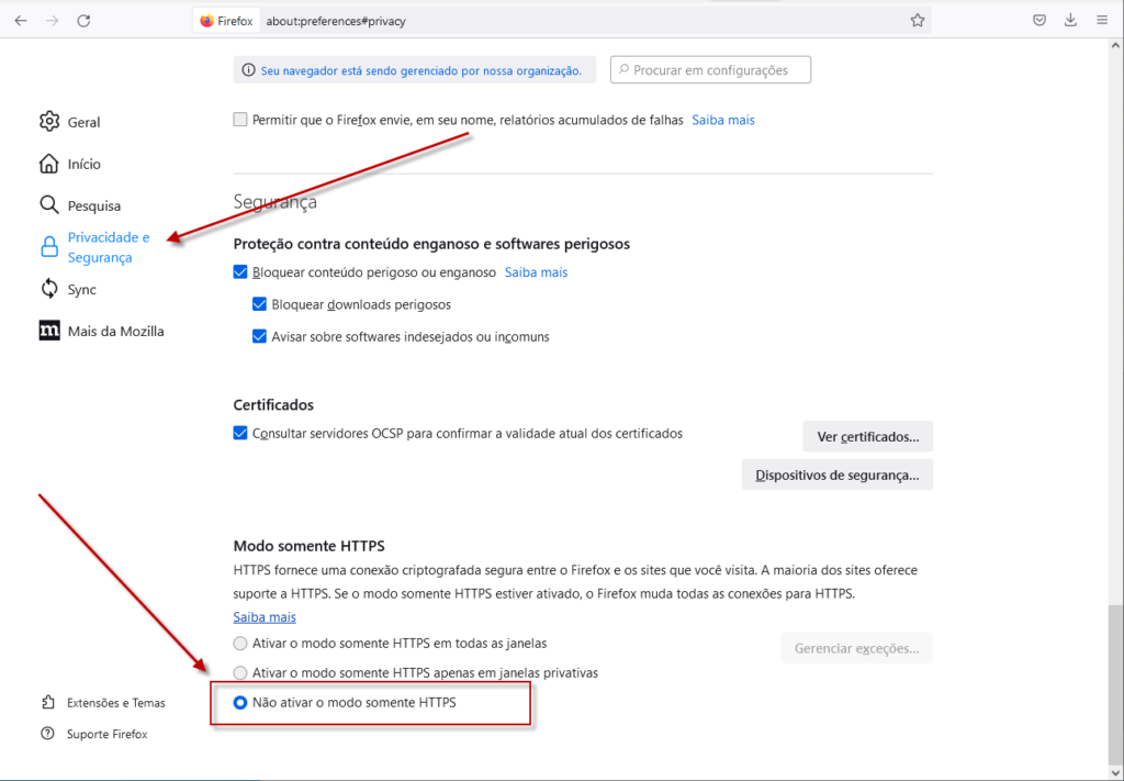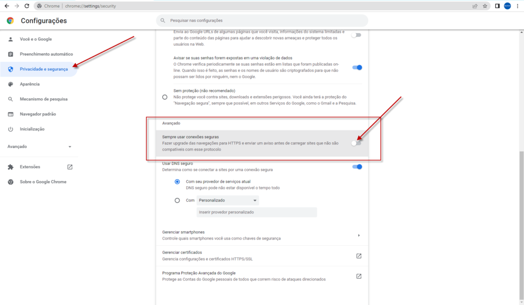 Outra configuração que deve ser feita para não ter problemas durante a navegação do portal é alterando as CONFIGURAÇÕES do seu navegador quanto a Privacidade e Segurança em páginas https. Como o PORTAL foi desenvolvido em http é necessário desativar esta opção e assim conseguirá navegar normalmente pelo site.