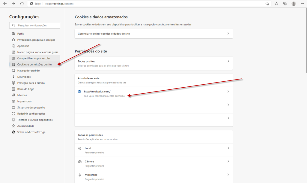 No Microsoft Edge adicione o endereço http://multiplus.com e libere as permissões para o site da MULTIPLUS