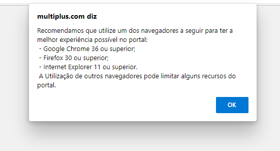 Para acessar o conteúdo do PORTAL do USUÁRIO da MULTIPLUS é necessário verificar se os navegadores que está utilizando são compatíveis como apresentado na tela abaixo:
