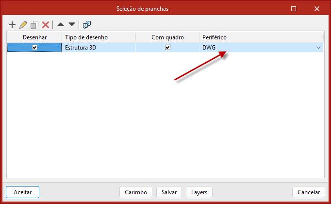 Clique em periférico conforme imagen exemplo abaixo e selecione a saída em DWG ou DXF como quiser, e clique em ACEITAR
