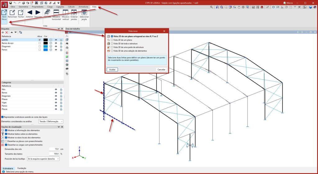 O primeiro passo é gerar a vista utilizando a opção Vista > Abrir Nova > Vista 2D e selecione os eixos da vista.