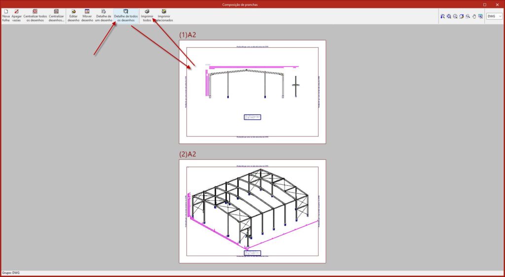 Aguarde a geração da prancha e clique em Detalhe de todos os desenhos como na imagen exemplo abaixo para visualizar como o desenho foi gerado. Depois clique em Imprimir todos.