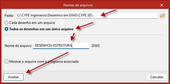 Na janela exemplo seguinte indique aonde deseja que o arquido de cad será gerado, selecione se cada prancha fica em dwg separado ou unificado. Dê nome ao arquivo e clique em Aceitar.